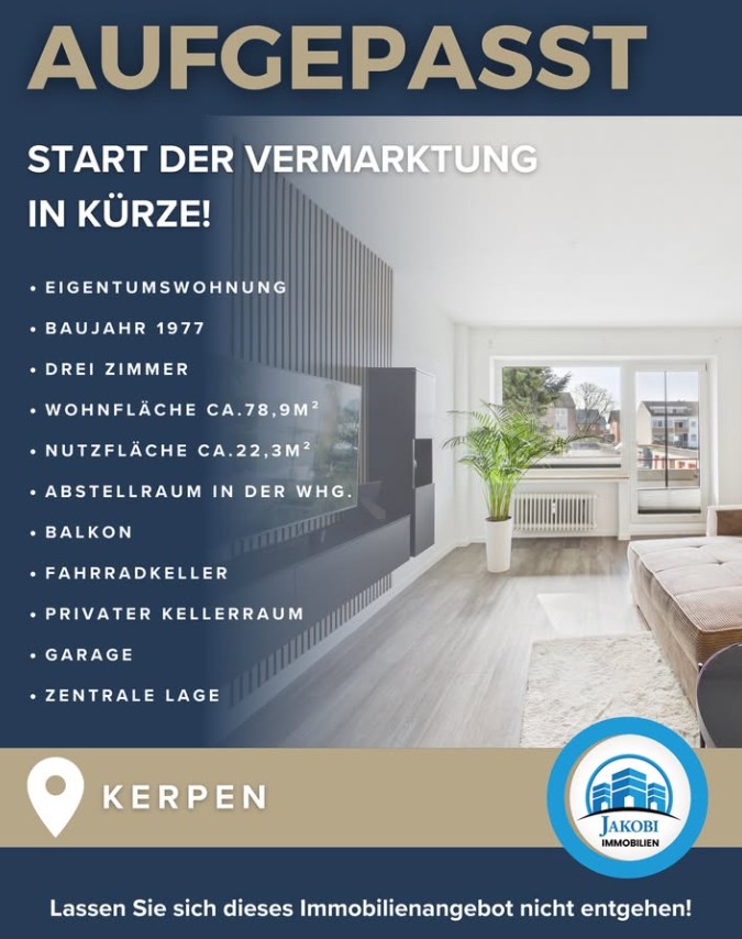In Kürze dürfen wir Ihnen eine äußerst gepflegte 3-Zimmer-Eigentumswohnung in zentraler Lage von Kerpen präsentieren. Die Wohnung überzeugt durch eine durchdachte Raumaufteilung, helle Räume sowie einen Balkon, der zusätzlichen Wohnkomfort bietet.