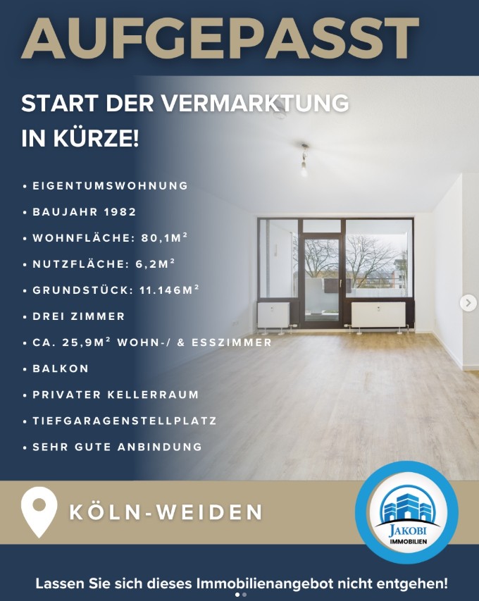 Bald schon präsentieren wir Ihnen ein weiteres lukratives Angebot. Diese Eigentumswohnung befindet sich in Köln-Weiden in unmittelbarer Nähe zum RheinCenter. Sämtliche Einrichtungen des täglichen Bedarfs, Ärzte, Gastronomie sowie der ÖPNV sind fußläufig erreichbar. Die Verkehrsanbindung ist hervorragend – sowohl in Richtung Kölner Innenstadt als auch ins Umland.