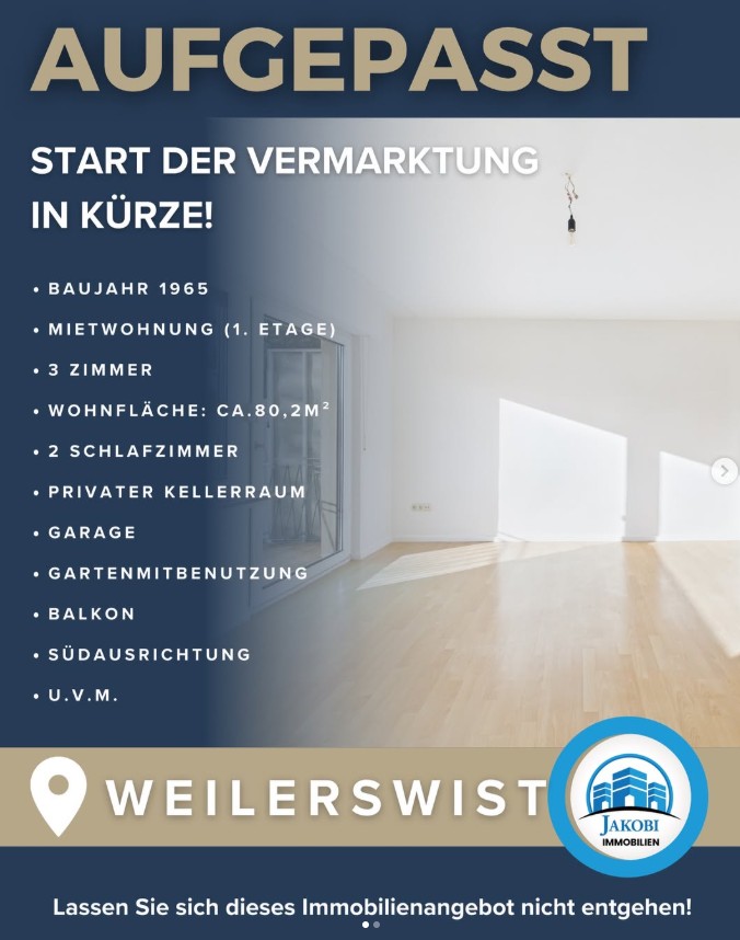 Schon bald beginnen wir mit der Vermarktung einer Mietwohnung im beliebten Weilerswist. Diese Immobilie überzeugt unter anderem mit Ihrer außergewöhnlichen Lage und dem Potential dieser Wohneinheit. Außerdem verfügen wir ebenfalls über die Vermietung der anderen Wohneinheit dieses 2-Familienhauses.🍀✨