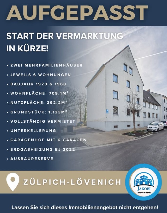 Ein attraktives Immobilieninvestment steht kurz vor dem Vermarktungsstart. Dieses Angebot befindet sich in ruhiger Lage von Zülpich-Lövenich und umfasst zwei Mehrfamilienhäuser, wobei jedes Wohnhaus über sechs abgeschlossene Wohneinheiten verfügt. Insgesamt ergeben sich somit zwölf Wohneinheiten – eine solide Grundlage für eine nachhaltige Kapitalanlage. Die Immobilien sind vollständig vermietet und profitieren von einer stabilen, gewachsenen Mieterstruktur.
