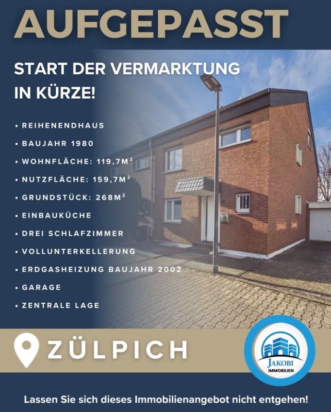 In Zülpich bereiten wir aktuell ein gepflegtes Reihenendhaus aus dem Baujahr 1980 für den Vermarktungsstart vor. Die Immobilie wurde in solider Massivbauweise errichtet und überzeugt insbesondere durch ihre durchdachte Raumaufteilung sowie die attraktive Kombination aus ruhiger Sackgassenlage und gleichzeitig zentraler Infrastruktur.