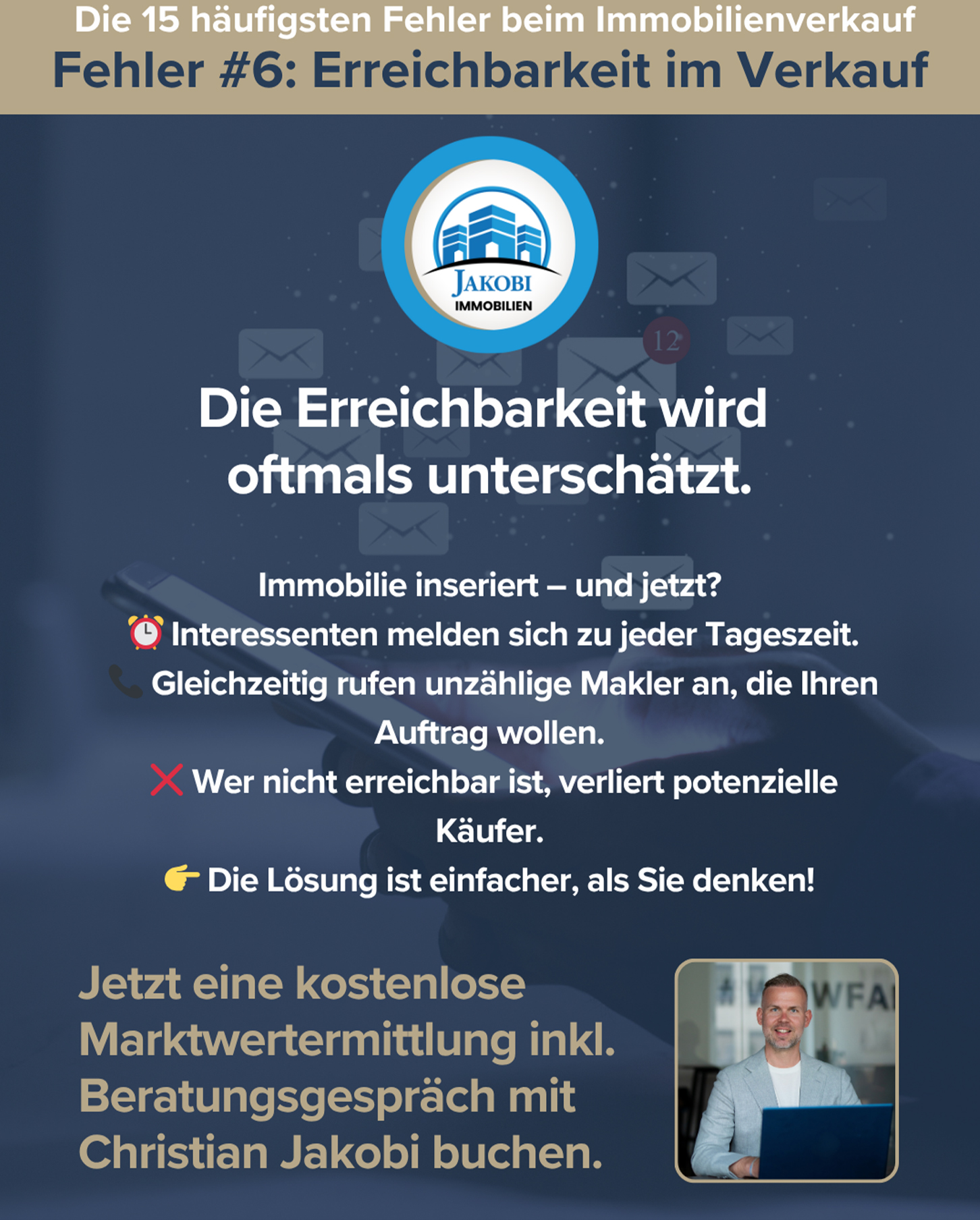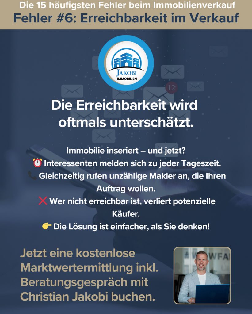 👉 Die Lösung? Einfacher als gedacht: Mit Jakobi Immobilien verlieren Sie keinen Interessenten. Wir sind 365 Tage im Jahr für Käufer & Verkäufer erreichbar.