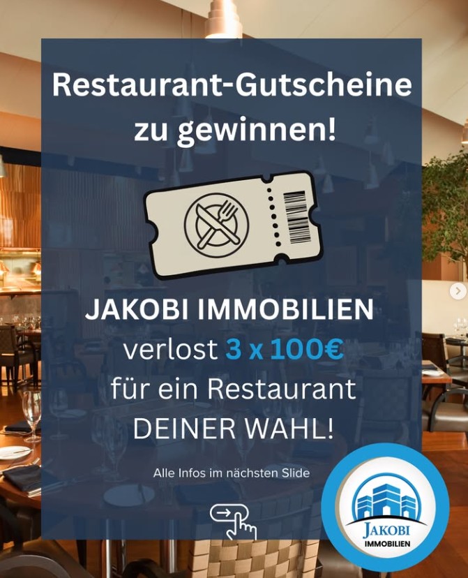 Dieses Gewinnspiel steht in keiner Verbindung zu Instagram und wird in keiner Weise von Instagram gesponsert, unterstützt oder organisiert. Ansprechpartner und Verantwortlicher ist ausschließlich Jakobi Immobilien.