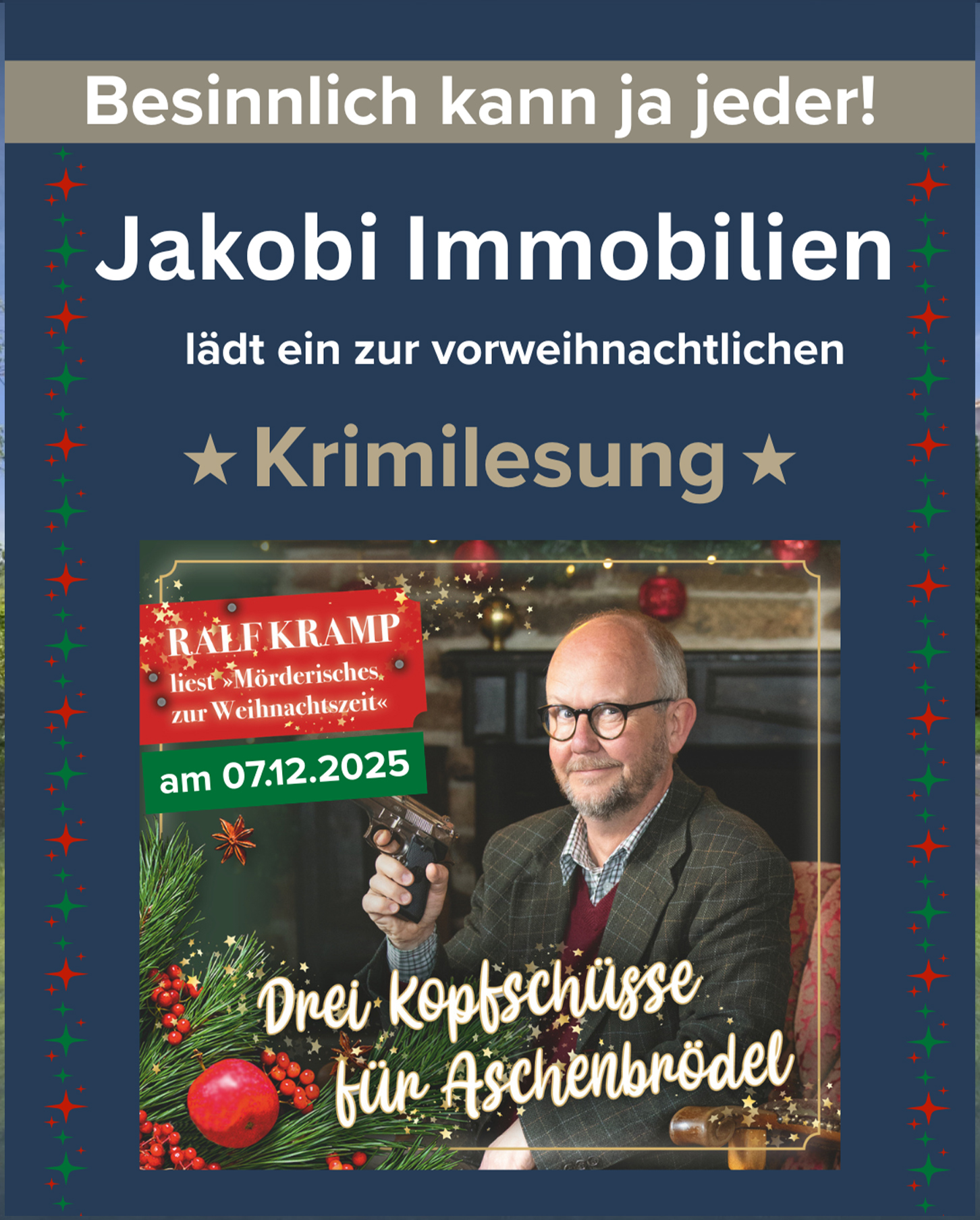 Wir bei Jakobi Immobilien möchten mit dieser Veranstaltung Danke sagen – für das Vertrauen, die Treue und die gemeinsame Zeit in unserer Heimat. Deshalb laden wir Sie herzlich ein zu einer kostenfreien, vorweihnachtlichen Krimilesung mit dem bekannten Autor Ralf Kramp. 🎄