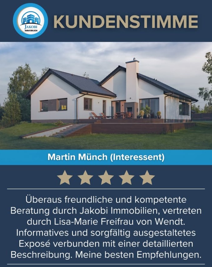 „Überaus freundliche und kompetente Beratung durch Jakobi Immobilien, vertreten durch Lisa-Marie Freifrau von Wendt. Informatives und sorgfältig ausgestaltetes Exposé verbunden mit einer detaillierten Beschreibung. Meine besten Empfehlungen.“