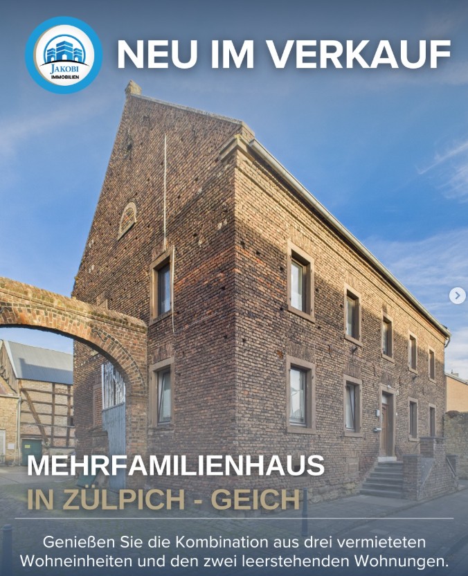 Ein charakterstarkes Mehrfamilienhaus in Zülpich – Geich mit Denkmalschutz und attraktivem Entwicklungspotenzial. Diese Immobilie vereint Historie mit solider Substanz. Auf einem Grundstück von ca.194m² bietet das Objekt eine Wohnfläche von ca.315,7m² sowie eine zusätzliche Nutzfläche von ca.182,6m². Insgesamt stehen fünf Wohneinheiten zur Verfügung, davon drei vermietet und zwei leerstehend – eine solide Ausgangslage für Kapitalanleger mit Blick auf Wertschöpfung durch Neuvermietung oder Optimierung.