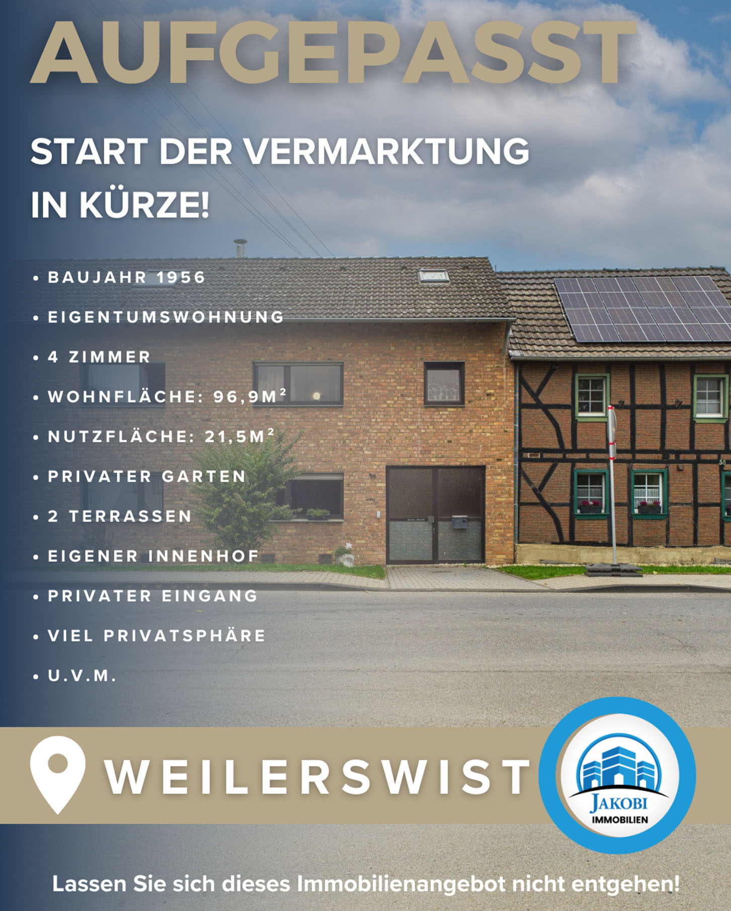 Wir kommen dem Vermarktungsstart wieder ein Stück näher. In Kürze präsentieren wir Ihnen diese geräumige Eigentumswohnung. Diese Immobilie befindet sich in guter Lage von Weilerswist-Hausweiler und eignet sich sowohl zur Eigennutzung, als auch zur Kapitalanlage. Sie bietet mit einer Wohnfläche von ca.96,9m² ausreichend Platz um die individuellen Wohnträume zu verwirklichen.🍀✨